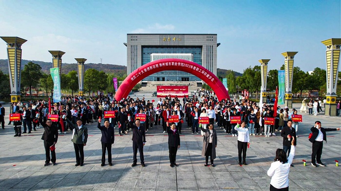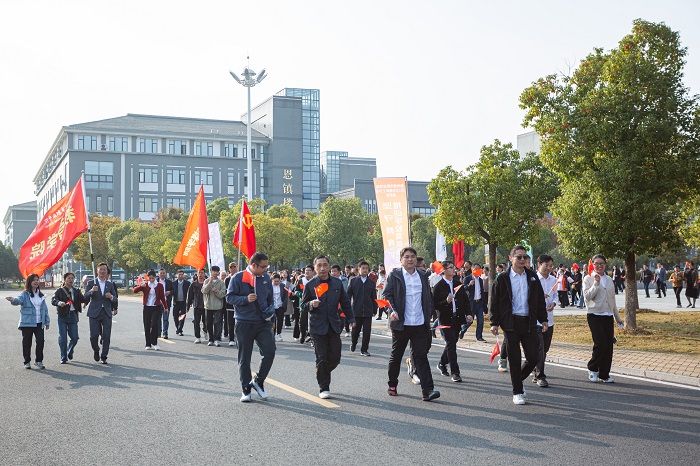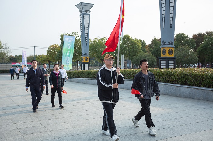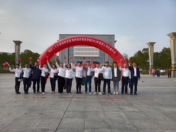 在举国上下学习贯彻党的二十大精神之际,11月3日下午,我校隆重举行2022年“欢庆二十大,奋进新征程”教职工统一着装环校健步走活动。健步走仪式在图文中心南广场举行,仪式由工会副主席陈之娟主持,校党委书记张志华,党委副书记、校长汪上等校领导班子全体成员亲临仪式现场并为活动鸣枪发令,全校近500名工会会员参加了活动。