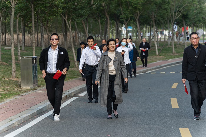随着清脆的发令声,环校健步走活动拉开序幕。校党委书记张志华,党委副书记、校长汪上,党委副书记牛春雨等校领导身着白村衫,佩戴党员党徽,在党旗引领下,走在队伍的前列,带领广大教职工们按照指定的线路,步伐矫健地走在美丽如画的校园中。大家沐浴着阳光,惬意地呼吸着新鲜的空气,尽览校园湖水碧波荡漾,尽享健康运动带来的身心愉悦;大家奋勇争先,同时又不忘相互鼓励、相互帮助,奋力向终点进发。