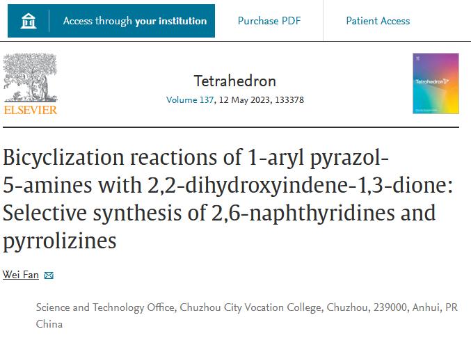 近日,医学院药学系博士范威在双环化反应领域取得重要进展,该成果发表在JCR Q2区期刊《Tetrahedron》正刊上,题为“Bicyclization reactions of 1-aryl pyrazol-5-amines with 2,2-dihydroxyindene-1,3-dione:Selective synthesis of 2,6-naphthyridinesandpyrrolizines”。范威为论文的独立兼通讯作者,滁州城市职业学院为第一单位(图1)
