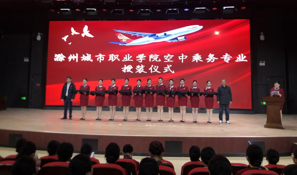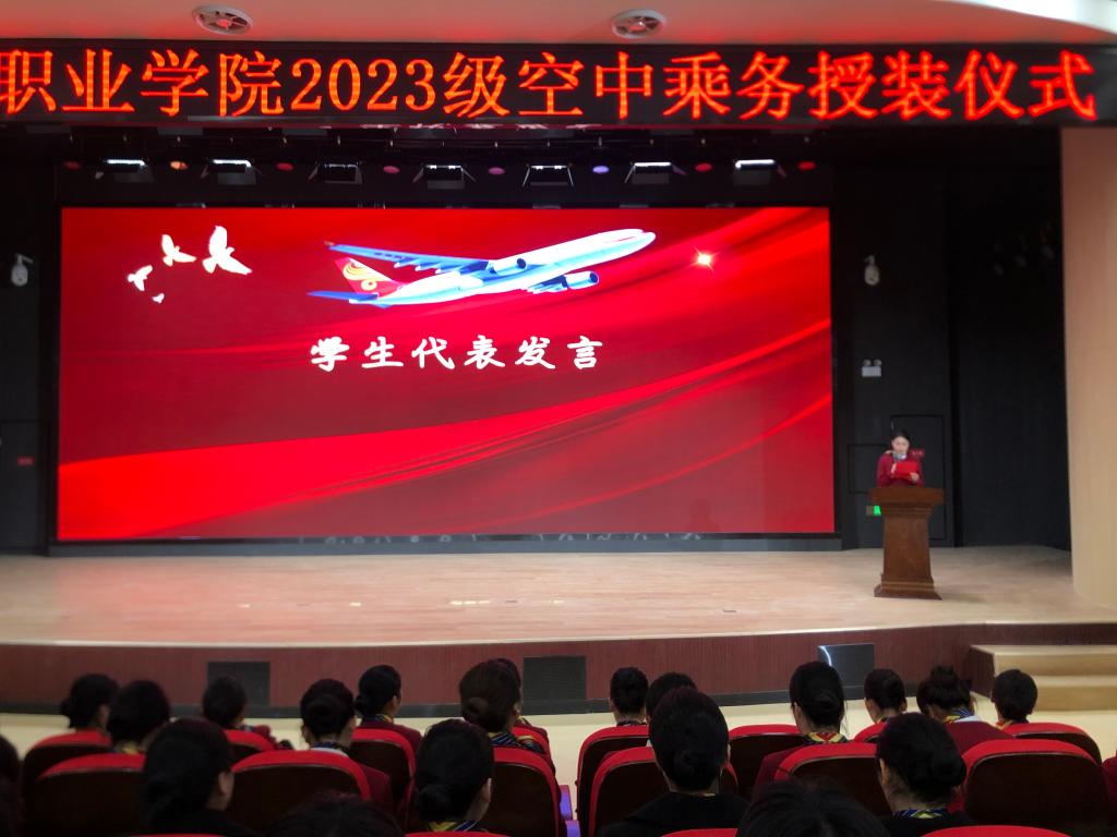 在肃静的报告厅中,空中乘务班的学子们从领导手中接过代表民航人风采的制服,标志着从这一刻起,23级全体空乘班同学正式成为了准民航人。