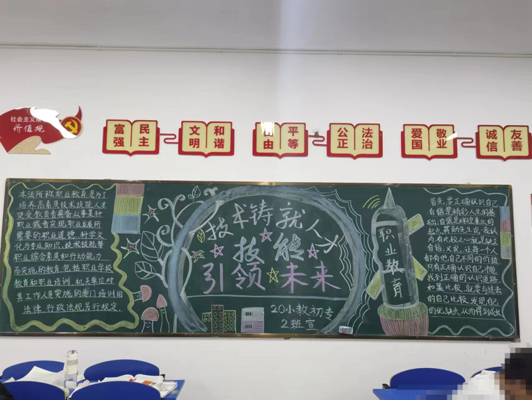 为丰富校园文化建设,营造尊重技能、崇尚技能、人人学习技能、人人享有技能的校园风尚,同时让广大同学了解职业教育、热爱职业教育,在职业教育活动周启动后,教育学院充分利用各宣传阵地,广泛开展职业教育宣传,营造了职业教育大有可为、大有作为的良好氛围。同学们创作的黑板报以图文并茂的形式呈现于创作中,形象、全面地展现了专业特色,大力弘扬工匠精神,为职业教育活动周增添了别样的色彩。