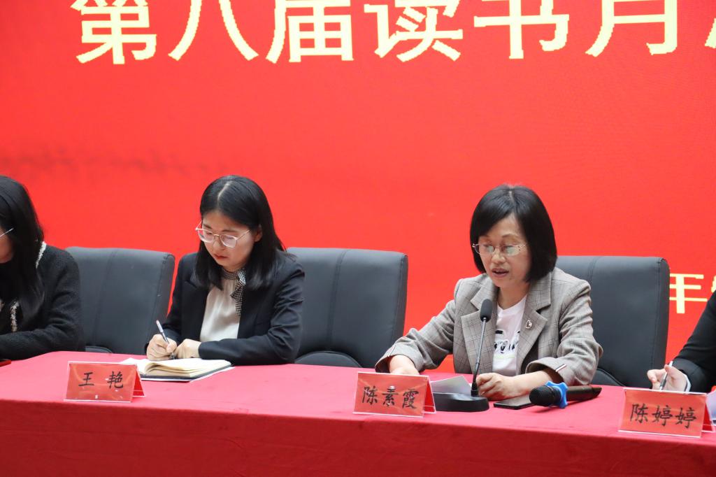 大会伊始,陈素霞对第八届读书月系列活动做总结,她对读书月期间开展的各项读书活动表示充分肯定,对积极参加活动的学生和老师给予盛赞。她指出,本届读书月以读书为契机,激发了广大师生读书的兴趣与热情,让每一位师生都亲近书本,喜爱读书,学会读书,希望全校师生要自觉把读书当成一种生活态度和精神追求,多读书、读好书,以书为友、以学促行,在读书学习中立大志、明大德、成大才、担大任!