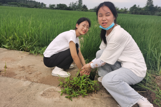 在滁州市农业科学研究院刘淼才主任的带领下,大家来到了黄圩村水稻试验基地,了解了水稻试验基地的基本情况、水稻的种植和生长过程等知识。正在大家感叹粮食来之不易之时,远远看到正在拔草的农民。刘淼才说,我们采用人工拔草,没有使用除草剂,这样既能保证收获健康安全的粮食,又能在除草的同时疏松土壤,增加土壤的透气性,减少农药残留,也有利于水稻的生长,为收获提供保障。大家听后便主动提出帮忙拔草,也想为本地水稻科研贡献自己的一份力量。但是从未下过田地的学生们哪里有水稻田里拔草的经验,于是,学生们便虚心地听专业人员讲解了水稻和杂草的区别以及拔草的正确方法。