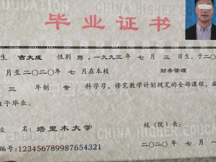 毕业证书制有镂空微缩(透光可见)文字“高等教育”中英文激光镭射安全线