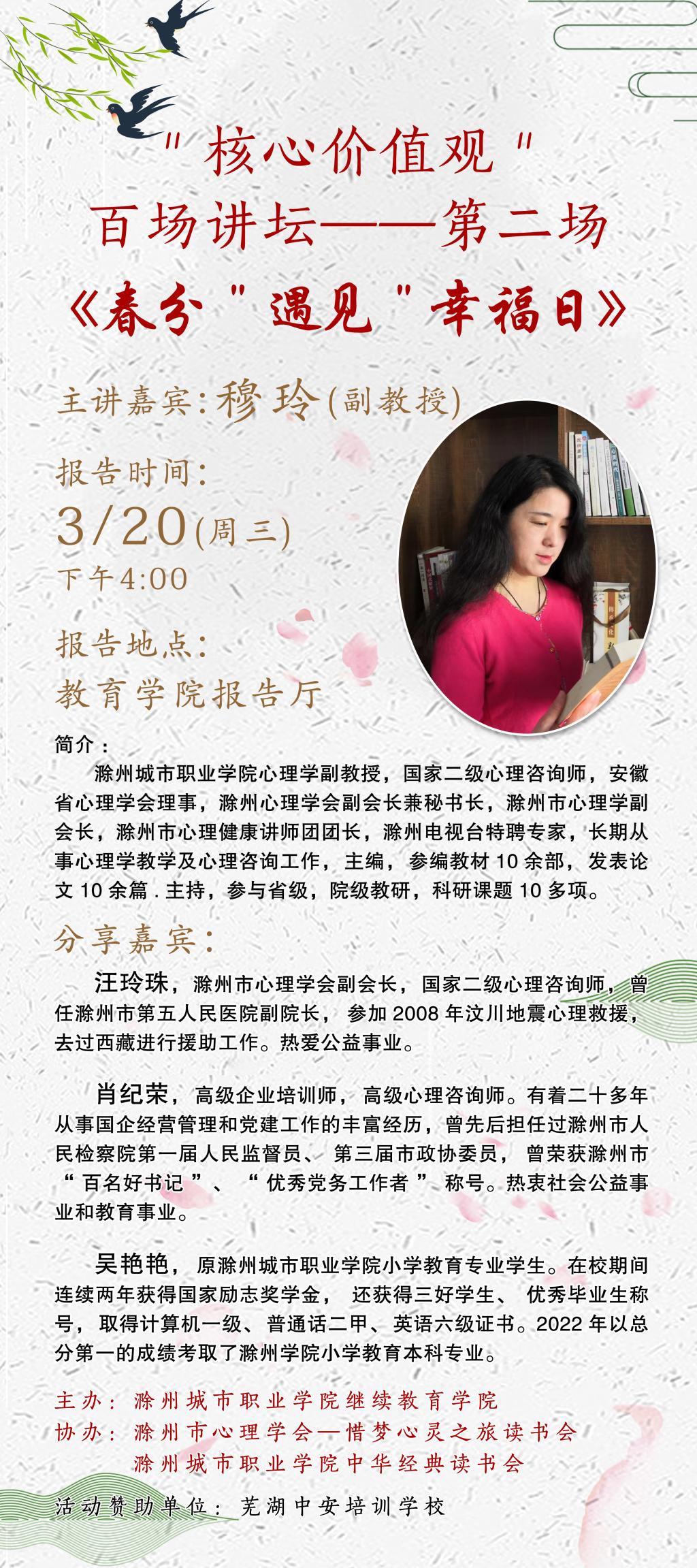 穆玲:滁州城市职业学院心理学副教授,国家二级心理咨询师,安徽省心理学会理事,滁州心理学会副会长兼秘书长,滁州市心理学副会长,滁州市心理健康讲师团团长,滁州电视台特聘专家,长期从事心理学教学及心理咨询工作,主编,参编教材10余部,发表论文10余篇·主持,参与省级,院级教研,科研课题10多项。