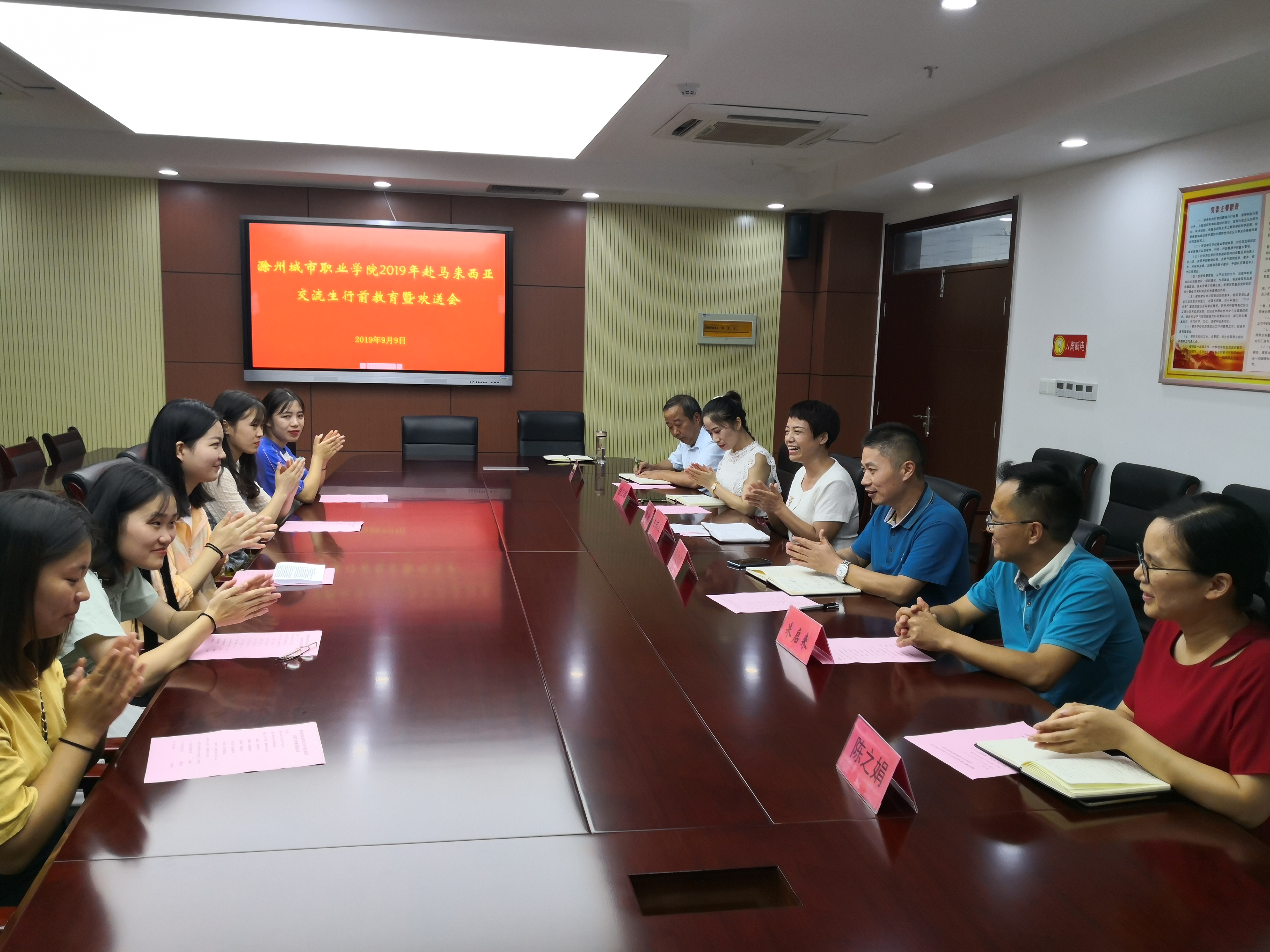 9月9日下午3点,在图文中心第四会议室, “滁州城市职业学院2019年赴马来西亚交流生行前教育暨欢送会”在这里顺利举行,学生处处长杨如江、教务处副处长陶国安、以及护理系党总支副书记朱启来、教育系党总支副书记陈之娟、医学系党总支副书记徐立娟以及5名交流生参加了会议,会议由继续教育中心主任许梅主持。