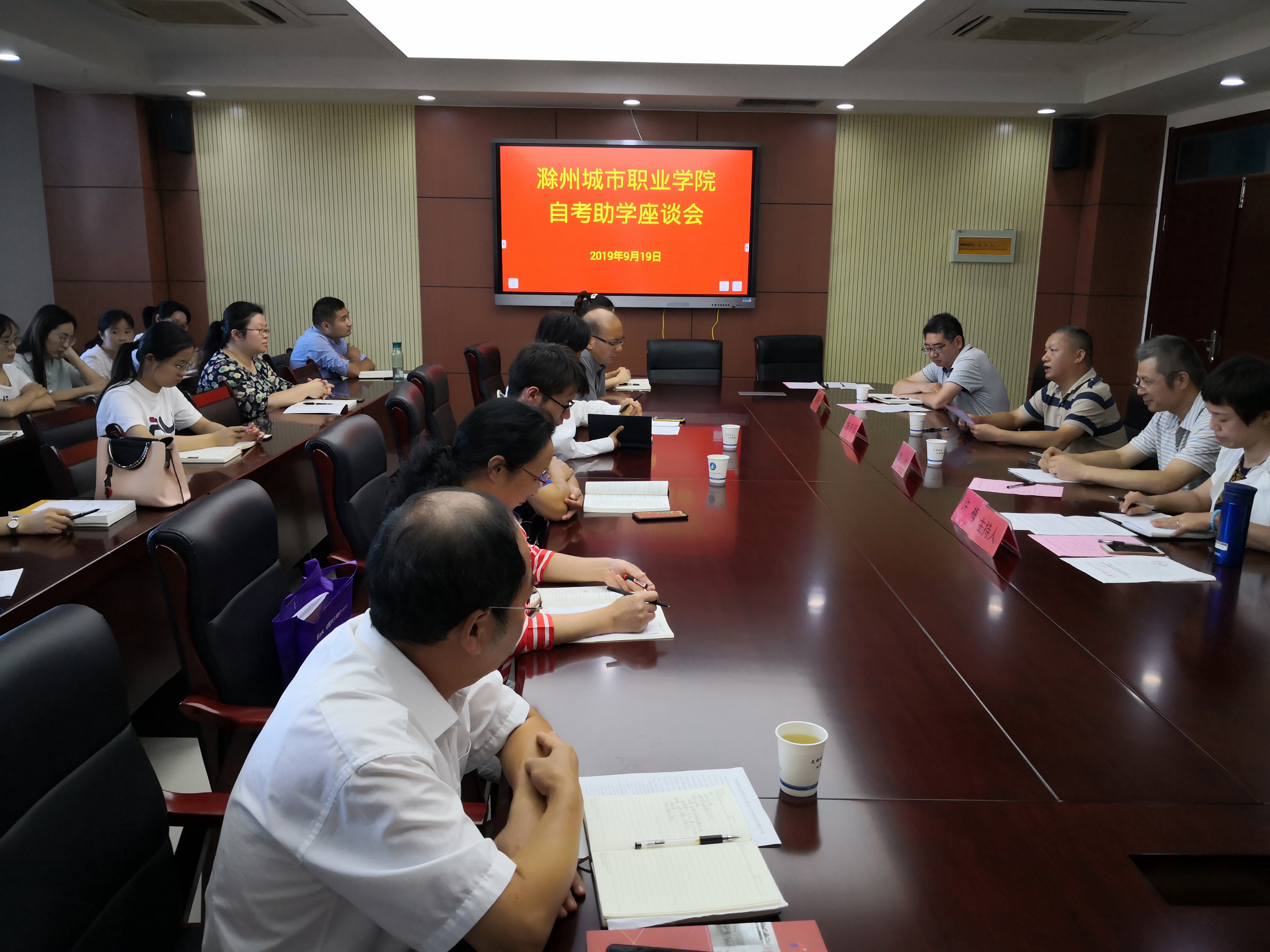 9月19日下午,我院自考助学座谈会在图文中心第四会议室举行,院党委委员、副院长施向阳,安徽师范大学继续教育学院自考中心主任季骠,教育系副主任高国柱以及2019级自考助学辅导班的全体任课教师和班主任参加了座谈会,座谈会由继续教育中心负责人许梅主持。