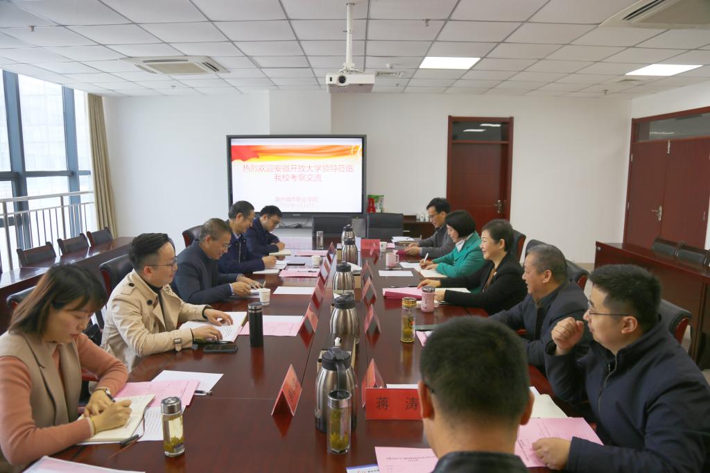 3月11日上午,安徽开放大学党委委员、副校长朱彤,园区管理中心主任、继续教育学院院长、学分银行管理中心主任李翔等一行5人到我校考察交流。校党委书记张志华,党委副书记、校长汪上,党委委员、校领导施向阳,继续教育学院院长许梅、副院长张晓杰及全体工作人员参加交流会及校内参观考察。交流会议由施向阳主持。