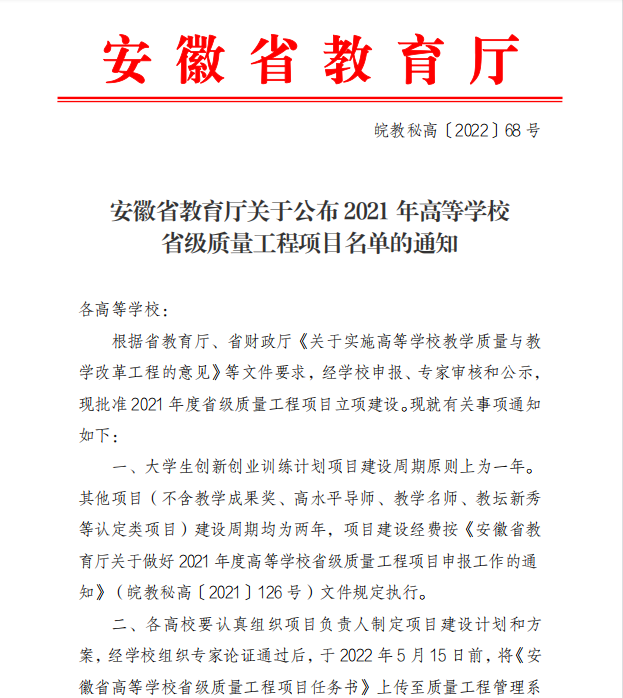 近日,《安徽省教育厅关于公布2021年高等学校省级质量工程项目名单的通知》发布,继续教育学院副院长、副教授张晓杰主持申报的教学成果《提质培优背景下的高职院校继续教育综合改革与实践研究》获安徽省教学成果奖三等奖,获奖成员包括党委委员、校领导、教授施向阳,继续教育学院院长、副教授许梅等。此外,张晓杰主持的《基于提质创新的高校继续教育管理政策及体制机制改革研究》获批立项为安徽省继续教育教学改革重点项目。