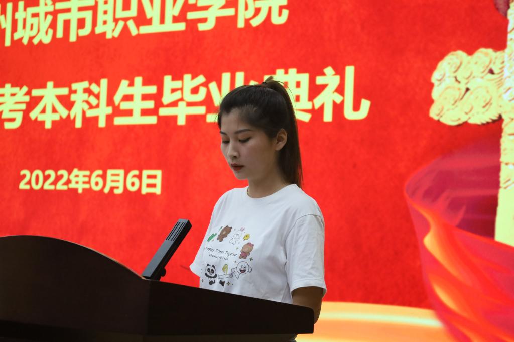 仪式上,继续教育学院副院长张晓杰说明了2022年自考毕业生相关情况,施向阳宣读2022年自考本科毕业证书颁发名单,并由与会领导现场颁发证书。郁艳雨、赵欣悦两位同学代表毕业生发言,表达了对母校培养的谢意,分享了自考过程中的心得体会和学习经验。