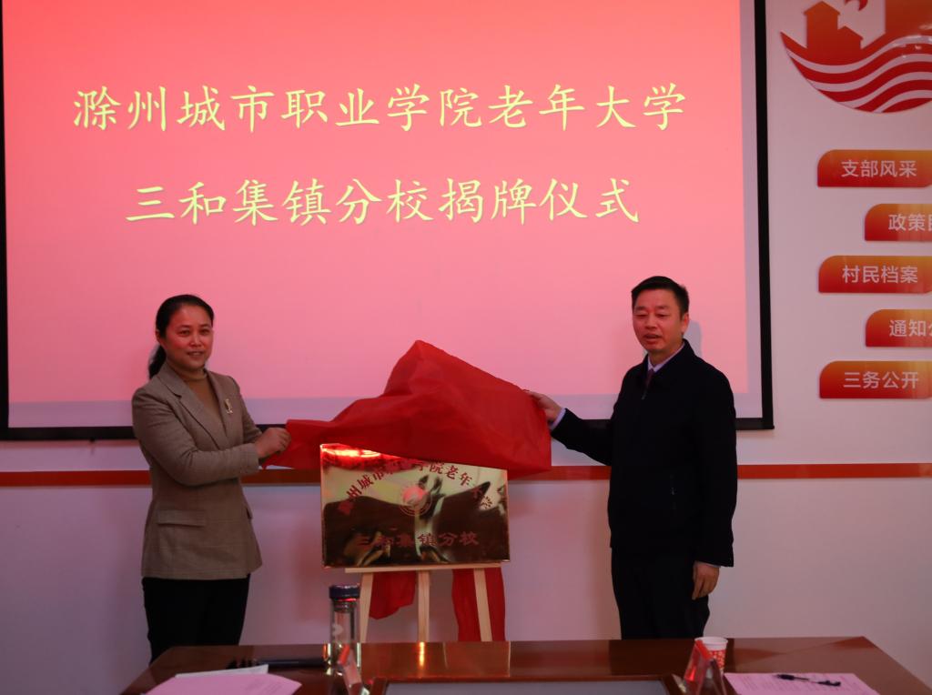 随后,汪上与许倩一起为滁州城市职业学院老年大学三和集镇分校揭牌。