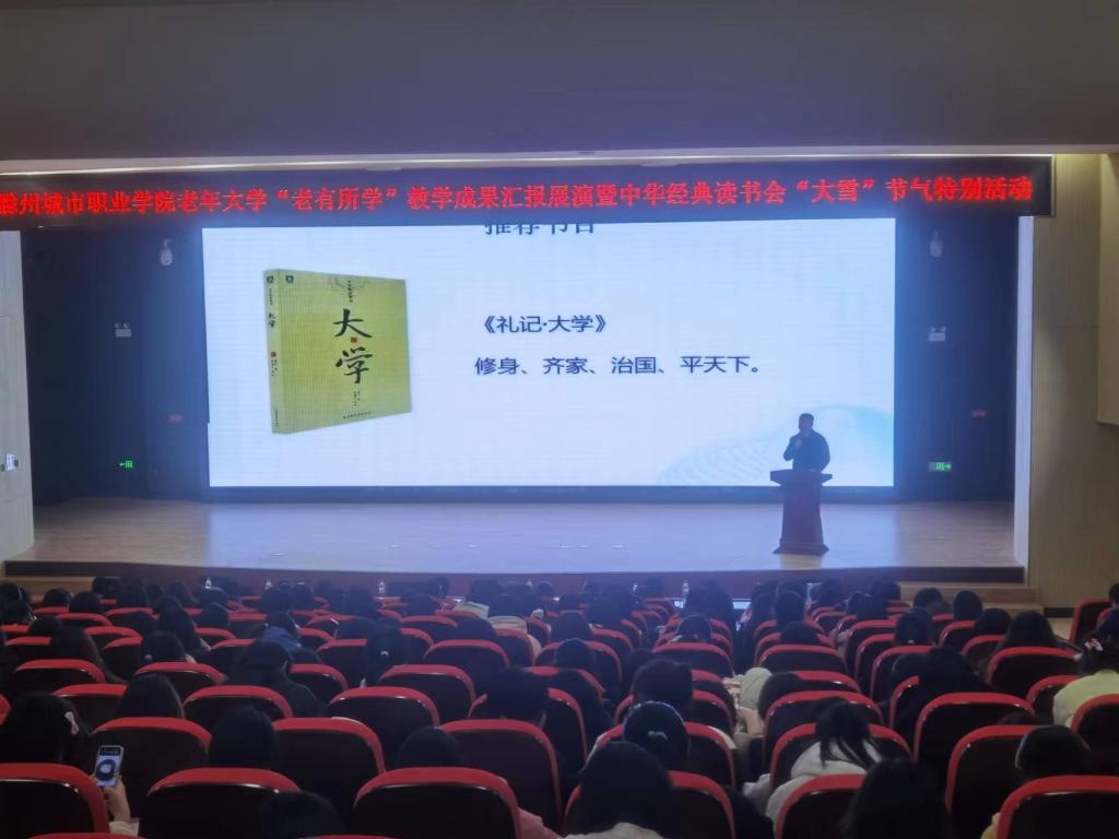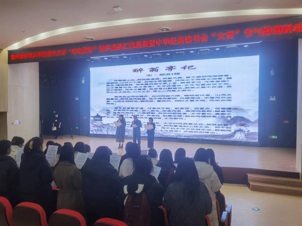 滁州城市职业学院老年大学自成立近两年来,经过校领导及师生的共同努力,今年校老年大学获得“滁州市老年教育示范学校”的荣誉称号;《坚持“三贴近 三体现”开展老有所学行动》案例在全国高校现代远程教育组主办的评选活动中荣获优秀案例奖并入选“中国老年教育优秀案例库”;校老年大学丰乐社区教学点成功当选为“2023年乡镇(街道)老年学校省级示范校”。为充分展示我校老年大学学员风采,同时弘扬中华优秀传统文化,推进“书香校园”建设,培养青年学生的阅读习惯,在学校形成爱读书、读好书、想读书的浓厚氛围,12月7日下午,在我国传统的二十四节气—“大雪”节气来临之际,宣传统战部、继续教育学院、团委共同举办校老年大学“老有所学”教学成果汇报展演暨中华经典读书会“大雪”节气特别活动。校党委委员、校老年大学校长施向阳,校党委委员、宣传统战部部长陈通,校老年大学常务副校长、继续教育学院院长许梅,团委书记陈婷婷以及中华经典读书会近400名会员参加了活动。