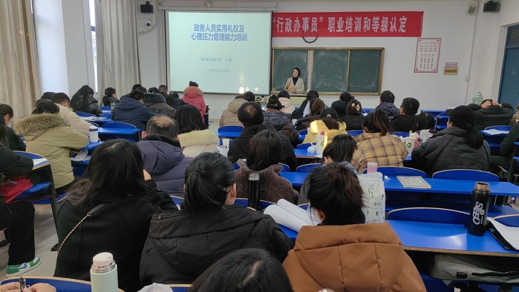 来自县市区行政服务窗口56名工作人员参加了培训。12月17日-22日,学员利用业余时间通过线上平台学习政务人员实用礼仪及心理压力管理能力等内容。23日-24日在我校参加线下培训,在培训过程中,学员认真记录课堂内容,投入学习专业知识。学员表示通过此次培训,充分感受到滁州城市职业学院教师的专业素质,提高了自身的业务水平、抗压能力,对今后的工作有很大的帮助。为确保培训质量,继续教育学院合理安排培训课程,优选培训教师,全程监控录像。