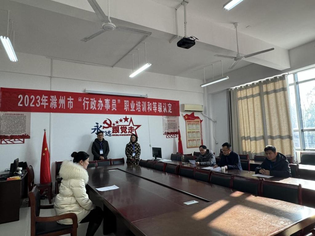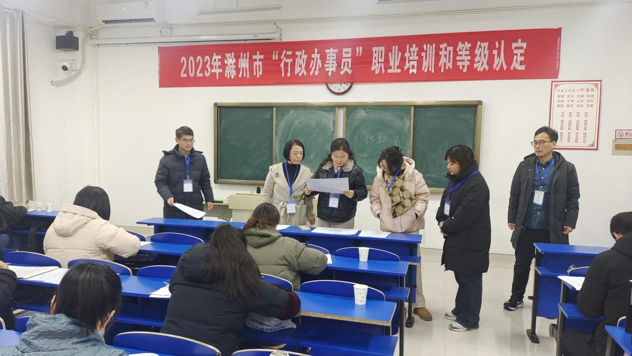 12月23日下午,我校受滁州市数据资源管理局委托,开展行政办事员技能培训与认定考试,我校校党委委员施向阳、市数据资源管理局副局长许福华、市人力资源和社会保障局技能鉴定科科长姜梦莲、政务服务指导科科长刘娟、市人力资源和社会保障局技能鉴定科科员胡闪闪到场督查巡考,继续教育学院院长许梅、副院长孟红军陪同参加。