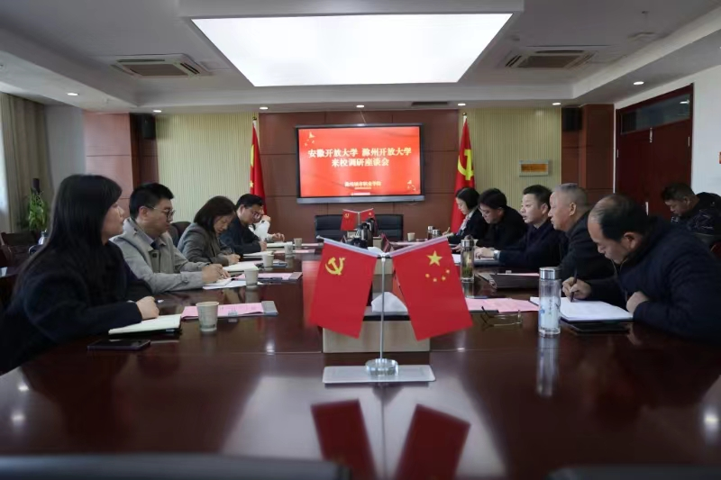 3月21日下午,安徽开放大学党委书记、校长杜爱玉一行来我校就开放大学服务高校开展调研,调研会在第四会议室举行。我校党委副书记、校长汪上,党委委员、校领导施向阳,党委委员、办公室主任陈通,教务处处长戴锦民、继续教育学院院长许梅出席会议。