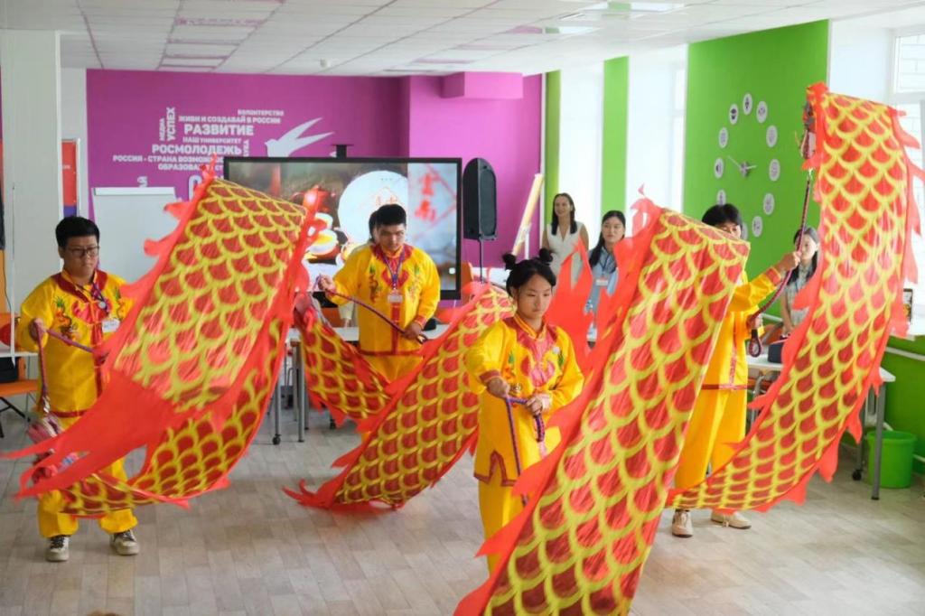 交流生给俄罗斯师生表演中国传统文化——舞龙