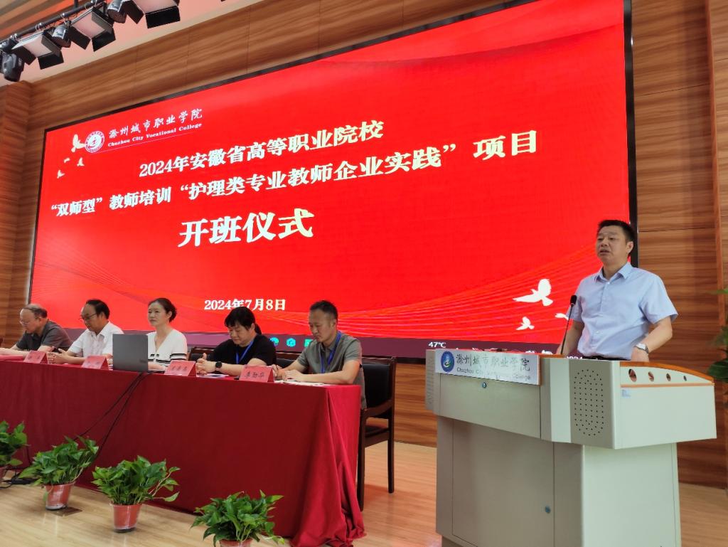 为贯彻落实《教育部等四部门关于印发<深化新时代职业教育“双师型”教师队伍建设改革实施方案>的通知》精神,深化职业院校教师队伍建设改革,培养造就高素质“双师型”教师队伍,由安徽省教育厅高等学校师资培训中心主办、滁州城市职业学院承办的2024年安徽省高等职业院校“双师型”教师培训“护理类专业教师企业实践”项目培训班,于7月8日上午在护理学院报告厅举行开班仪式。安徽省高等学校师资培训中心副主任张韬,安徽师范大学马克思主义学院教授、博士生导师赵平,我校党委副书记、校长汪上,护理学院院长金虹,继续教育学院院长许梅等出席开班仪式,来自全省18个院校的57名参训教师参加了仪式,开班仪式由许梅主持。