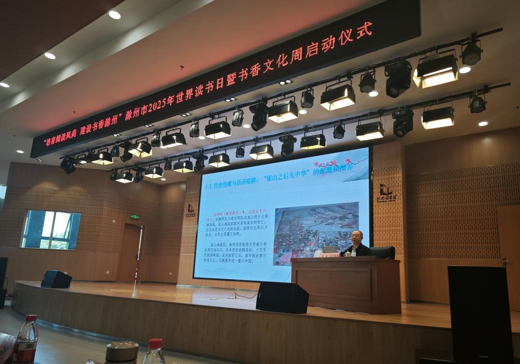 活动现场,师生们兴趣盎然的在非遗展、文创展、图书展等活动现场积极互动参与,并观看了精彩的文艺演出,演出以“经典诵读”“书香礼赞”等节目形式,生动展现了阅读的魅力。随后,中国科学技术大学博士生导师、中央电视台《百家讲坛》栏目主讲人钱斌教授,受邀作《江上流萤独坐听沉思往事立残阳一—关于宋文化的一些思考》的主题讲座,深入浅出地解析了宋代文学的历史脉络、人文精神及其对现代社会的启示。大家纷纷表示,讲座兼具学术性与趣味性,不仅加深了对传统文化的理解,更激发了深入阅读经典的兴趣。校党委副书记牛春雨、副校长曹士东也到现场聆听了讲座。
