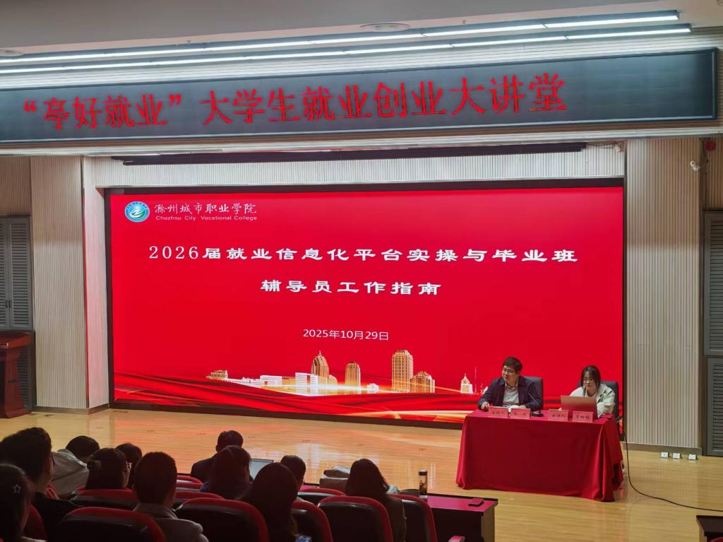 为全面提升我校就业工作队伍的业务能力,精准高效地做好2026届毕业生就业服务工作,2025年10月29日我校成功举办了“亭好就业”大学生就业创业大讲堂系列活动——安徽24365大学生就业服务平台使用培训会。本次活动特邀安徽信通信息服务有限公司工程师葛程程、张金华来校进行专题培训与答疑。学校七个学院的分管就业工作副书记、学管负责人以及全体2026届毕业班辅导员参加了此次培训。