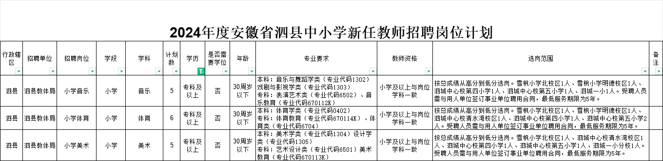 为做好2024年度安徽省泗县中小学新任教师公开招聘工作,根据《安徽省教育厅安徽省人力资源和社会保障厅安徽省机构编制委员会办公室安徽省财政厅关于进一步改进和完善中小学新任教师公开招聘工作通知》(皖教〔2019〕29号)、安徽省教育厅 省委编办 省财政厅省人社厅《关于进一步完善中小学教师招聘主体责任的通知》(皖教秘师〔2020〕90号)和安徽省退役军人事务厅 安徽省教育厅安徽省人力资源和社会保障厅《关于促进优秀退役军人到中小学任教的实施意见》(皖退役军人发〔2023〕6号)文件精神,现将有关事项公告如下: