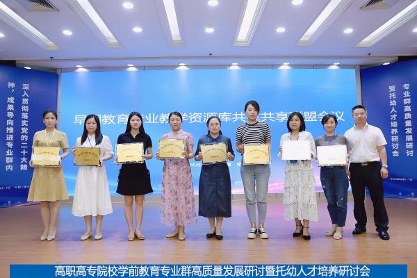 本次会议研讨内容涵盖早期教育专业、婴幼儿托育服务与管理专业建设与高素质人才培养,职业教育教学资源库建设,职业教育精品在线开放课程建设与“十四五”规划教材建设,职业教育产教融合等诸多方面。广西早期教育专业教学资源库共建共享联盟在会中为28个共建单位授牌,徐立娟作为滁州市城市职业学院教育学院代表上台领取牌匾。
