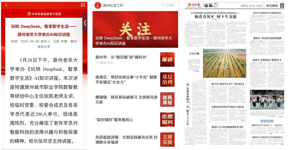为积极践行高校服务社会的责任担当,推动优质教育资源“走出去”,助力老同志“老有所学、老有所乐、老有所为”,5月28日下午,滁州城市职业学院教育学院张凯老师应邀走进滁州老年大学,为近200名老年学员开展主题为《玩转DeepSeek,智享数字生活》的AI知识讲座。此次活动是我院深化社会服务、响应“智慧助老”行动的生动实践。