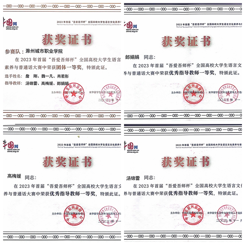 10月16日至10月19日,由山东淄博师范高等专科学校承办的2023年首届“吾爱吾师杯”全国高校大学生语言文化素养与普通话大赛决赛圆满落下帷幕。来自全国各地的49支代表队,经过四天的激烈角逐,我院来自19学前初专6班的肖若彤、21小教初专3班的詹刚、22学前高专5班的魏一凡三位同学获得全国总决赛(高职组)一等奖。(指导老师:汤锦蕾 高梅媛 郎娟娟)