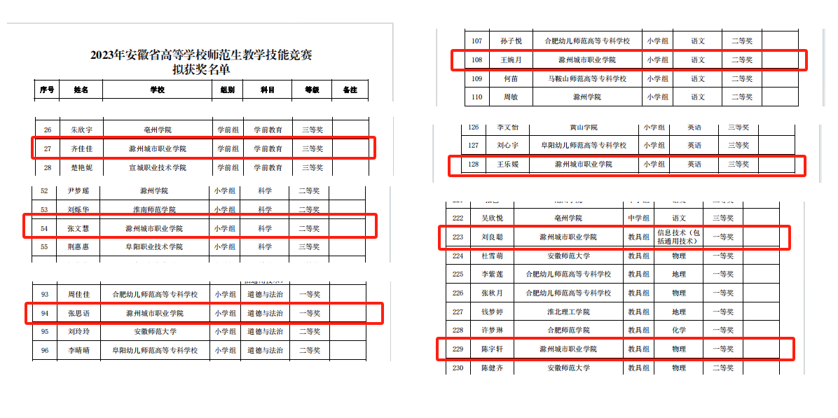 近日,大赛拟获奖名单在官网公示,教育学院选派9组选手参赛,共斩获一等奖3项,二等奖2项,三等奖3项。其中,参加现场总决赛的5组参赛学生均在比赛中获奖。具体获奖情况如下:2019级小学教育专业初专2班张思语获小学组道德与法治学科一等奖、2020级小学教育专业初专1班王婉月获小学组语文学科二等奖、2019级小学教育初专3班张文慧获小学组科学学科二等奖、2019级小学教育初专2班王乐媛获小学组英语学科三等奖、2022级学前教育高专8班齐佳佳获学前组三等奖,另教具组刘良聪团队,陈宇航团队均获得一等奖!