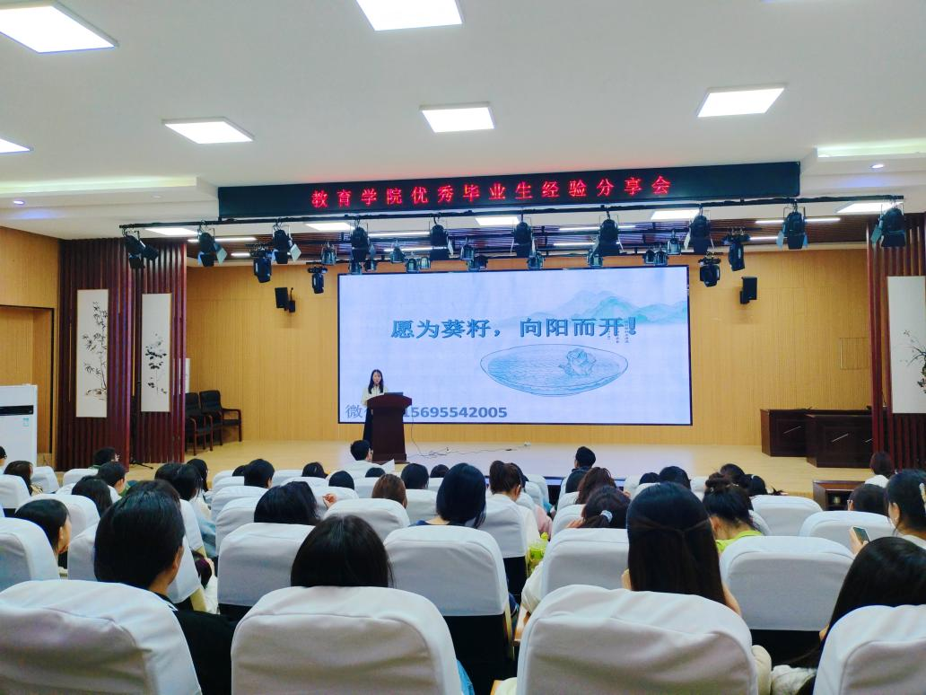 王德安,中共党员,2014级学前教育专业,在校期间曾任职教育学院学生会主席,曾创业谦达印象文化传媒公司,现就职于全椒米琪儿早教托育园,任职宣传主管。王学长首先分享了自己大学丰富的生活,从做音乐,创业当老板,当导演三个方面鼓励年轻人要有梦想,要为梦想付出脚踏实地行动。同时他也给我们的学生提出了几点建议:一是在校期间练好基本功,二是把该考的证都考到手,三是怀揣一份谦虚的态度,四是保持稳定的心态和钻研的精神。王学长的分享既精彩纷呈又诙谐幽默,多次被同学们热情的掌声打断。