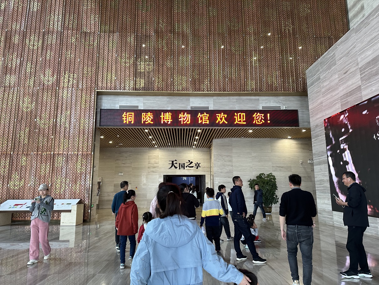参观完湿地公园,一行人接着来到铜陵博物馆。此馆展现了铜陵几千年来铜产业发展历史,博物馆中展示的青铜器不仅工艺精美,造型生动,有的还辅以到大量精美图片资料以及采用高科技展示方式,再现了古铜都三千多年的采冶铸历史。