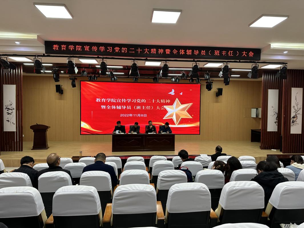 为深入学习宣传贯彻党的二十大精神,根据学校工作安排,教育学院于11月8日组织开展全体辅导员(班主任)党的二十大精神宣讲活动,积极引导辅导员(班主任)自觉用习近平新时代中国特色社会主义思想武装头脑、指导实践,推动党的二十大精神在学生中 “入脑”“入心”。党总支书记钱庆兵、副书记陈立超、副院长刘明辉、学管杨维懂老师以及全体辅导员(班主任)参加此次会议。