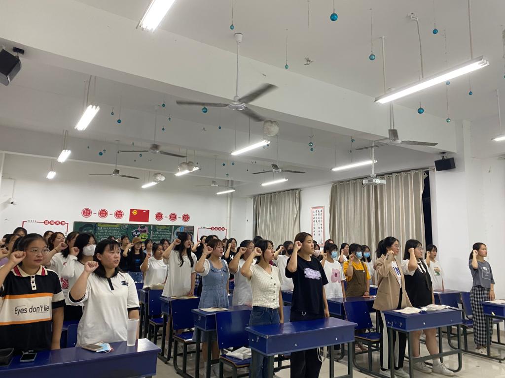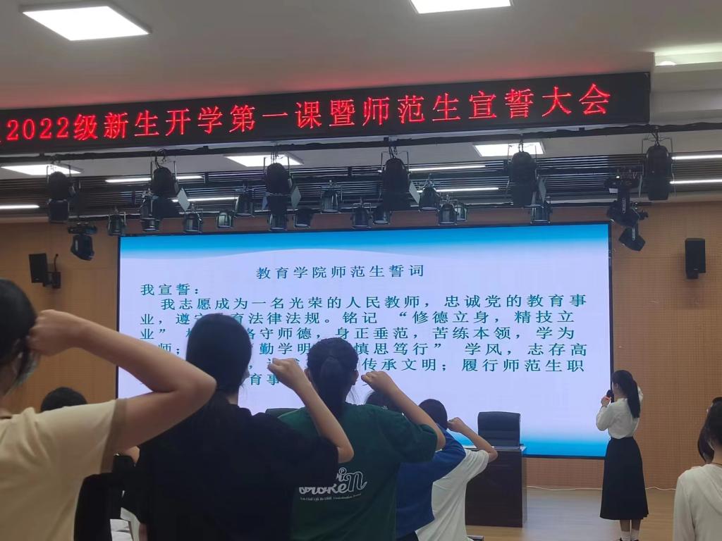 新的学期,开启新的希望;新的征程,承载新的梦想。9月18日,教育学院在学院报告厅举行2022级新生“开学第一课”暨师范生宣誓大会。教育学院党总支书记钱庆兵,校党委委员、教育学院院长高国柱,教育学院副院长刘明辉,学管秘书杨维懂,团总支书记黄正顺出席活动,新生辅导员(班主任)以及2022级新生40名代表参加线下仪式。受疫情影响,其他新生在各自班级以直播的方式同步参加了本次仪式。仪式由教育学院陈立超老师主持。