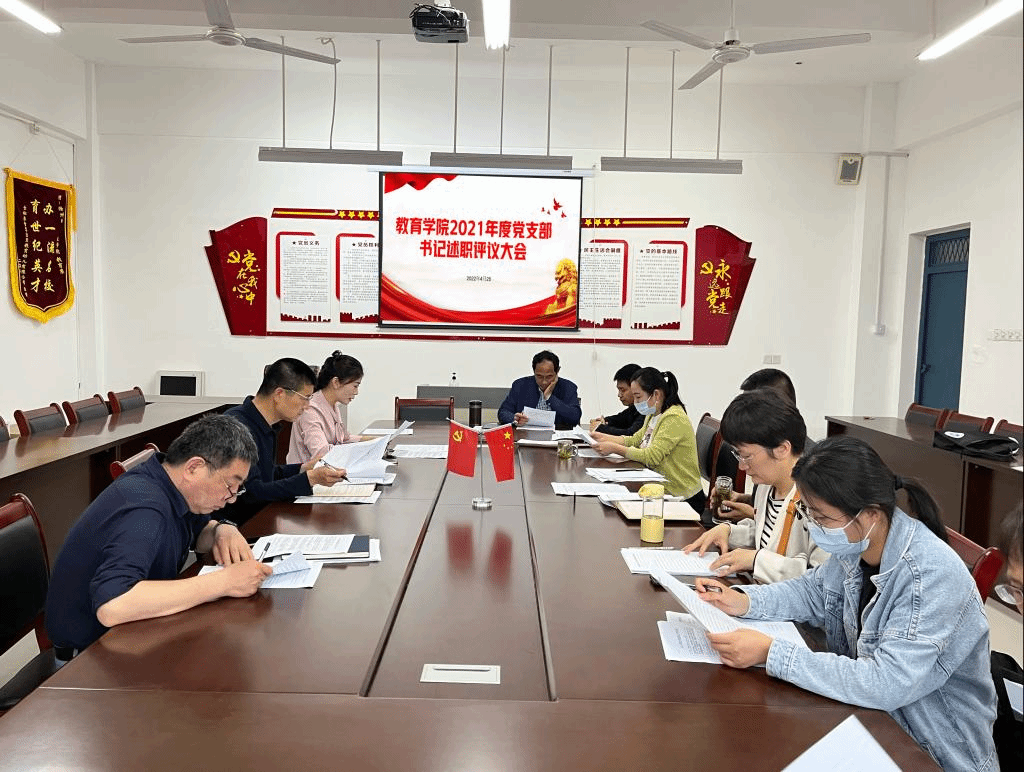 为进一步加强基层党组织建设,提升党支部战斗堡垒作用,根据学校2021年度基层党支部书记述职评议考核工作的安排,4月25日下午16时40分,教育学院党总支召开2021年度党支部书记述职评议会,党总支委员、教工支部支委成员、学生支部支委成员、党员代表、群众代表参加会议,党总支书记钱庆兵主持会议。