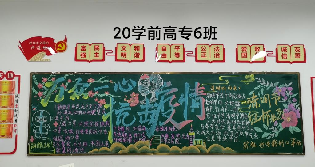 为做好疫情防控和缅怀革命先烈,教育学院团总支组织班级开展抗疫与清明的黑板报评比,通过这一方式让每一名学生在慎终追远、缅怀先辈的情怀中认知传统、尊重传统、继承传统。