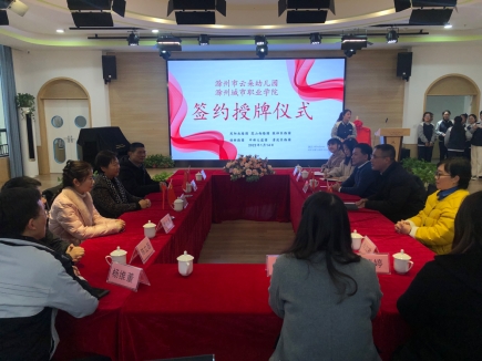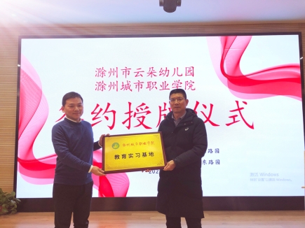 为进一步深化产教融合,推动学前教育专业建设与高质量发展,2022年1月14日下午,由滁州城市职业学院教育学院与滁州市亭城文化旅游有限公司共同举办的校企合作实习基地签约暨挂牌仪式在文旅公司云朵幼儿园(凤阳北路园)举办。