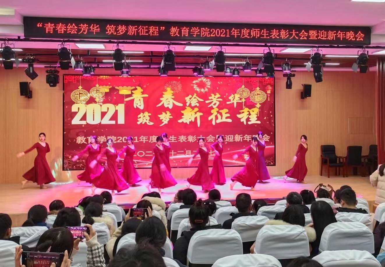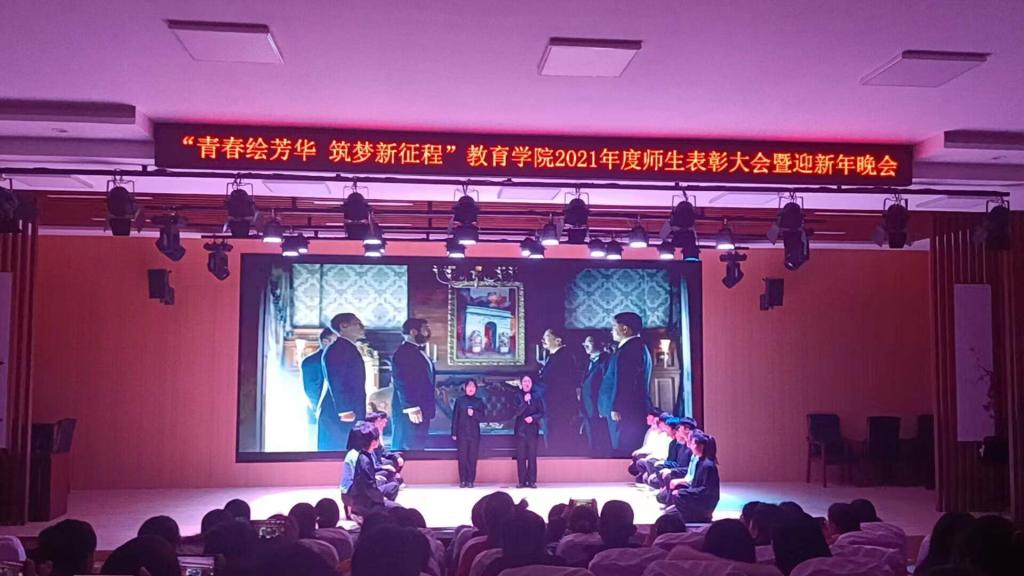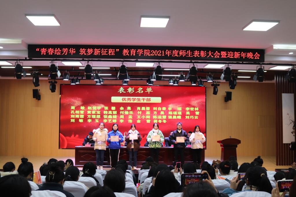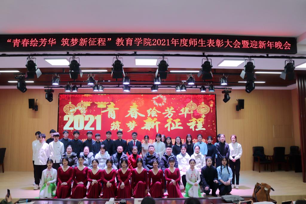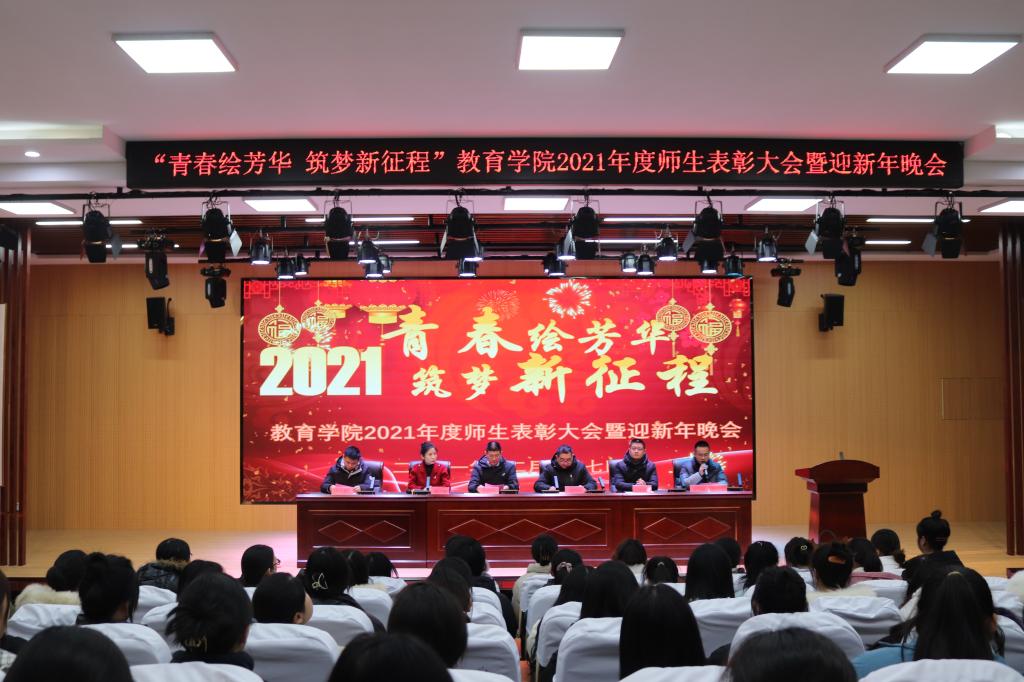 凝心聚力共奋进,砥砺前行再起航。12月27日下午,教育学院于报告厅隆重举办“青春绘芳华 筑梦新征程”2021年度师生表彰大会暨迎新年晚会。教育学院党总支书记钱庆兵,校党委委员、教育学院院长高国柱,教育学院党总支副书记徐立娟,教育学院副院长刘明辉,教育学院实验实训秘书陈立超出席大会。教研室主任、专职辅导员、近三年入职新教师、100余名获奖代表和在校生代表参加大会。表彰大会由教育学院团总支书记黄正顺主持。