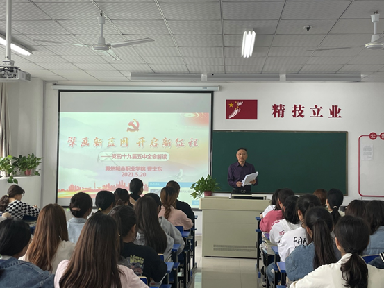 5月20日下午,学院党委委员、副院长曹士东为教育系20小教高专3班全体同学讲授《形势与政策》课程第一讲《擘画新蓝图 开启新征程——党的十九届五中全会解读》。