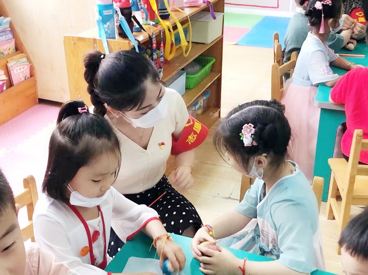 与此同时,在端午佳节来临之际,为了进一步弘扬中华民族传统文化,教育系党总支充分发挥我系专业优势,同丰乐社区工作人员深入丰乐社区所属幼儿园—滁州市第一幼儿园开展传统节日文化宣传志愿服务活动。在志愿者、社区工作人员和幼儿园老师们的细心指导下,小朋友们制作出了漂亮的五彩绳、五颜六色的创意彩蛋和饱满的粽子,在实际行动中更加直接地体会了端午文化。此外,志愿者们还向小朋友们讲述了端午节的历史由来,进一步加深了小朋友们对传统节日的认识。