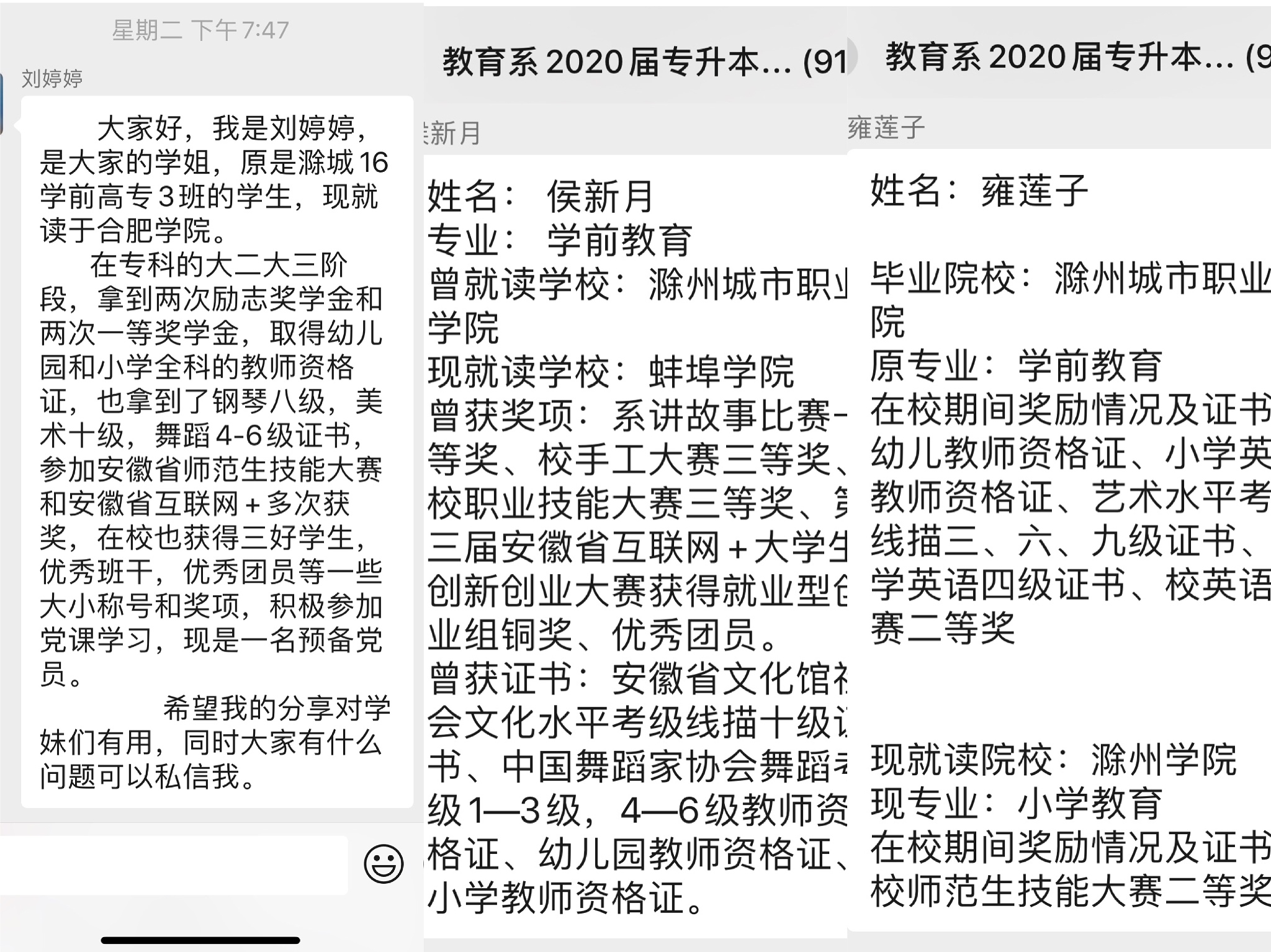 三位成绩优秀已成功升本的来自滁州学院小学教育专业、蚌埠学院学前教育专业和合肥学院学前教育专业的同学分别从目标、坚持、学习的计划和方法、信心和态度这六个方面进行了分享。她们每个人根据自己的备考和考试经验,详尽的分享了自己的学习方法、学习态度和学习诀窍等,大到知识的结构框架,小到错题本的使用方法,讲的具体、讲的耐心。会后他们与2020届毕业班的学弟、学妹们就他们关心的专业、升学、就业等方面问题进行了深入交流。