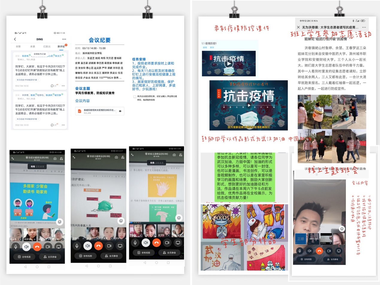 各班级通过雨课堂、学习通、钉钉视频会议、QQ群、微信群等多种形式与同学们在线上相约,不仅观看抗疫一线英雄的先进事迹等,引导同学们争做有担当有作为的青年大学生,还采用线上讨论、撰写感悟等形式,介绍了当前疫情形势、防控知识,加强了对同学们的爱国主义、社会责任感教育。与此同时,更针对当前的“停课不停学”线上学习提出具体的学习和考核要求,帮助学生明确线上学习的目标,加强线上学习学风建设。