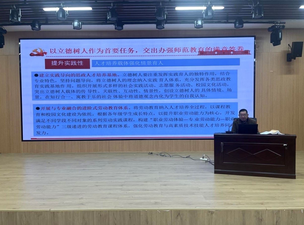 高国柱强调,以立德树人作为首要任务,交出办强师范教育的满意答卷,要立足人才培养目标强化“接班人”素质,提升政治性,深入开展优良学风、教风、作风建设,引领的文化育人活动;要立足人才培养方案强化高素质要求,强化“德技并修”的人才培养方案,提升人才培养的针对性和适应性,构建思政课程与课程思政同向同行的课程体系;要立足人才培养过程强化“双元”育人提升协同性,完善校校(园)双主体培养体制,创新校校(园)双主体培养模式;要立足人才培养载体强化情景育人提升实践性,建立实践导向的思政人才培养基地,开展与专业融合的进阶式劳动教育体系;要立足人才培养主体强化多方合力体现全员性,加强高水平教师队伍建设,统筹规划党政干部、共青团干部、思想理论课教师、辅导员、班主任、心理咨询教师六支主要队伍。最后,他要求全体教职工要准确把握师范教育立德树人的价值内涵、理论内涵与时代内涵,真正做到以文化人、以德育人。