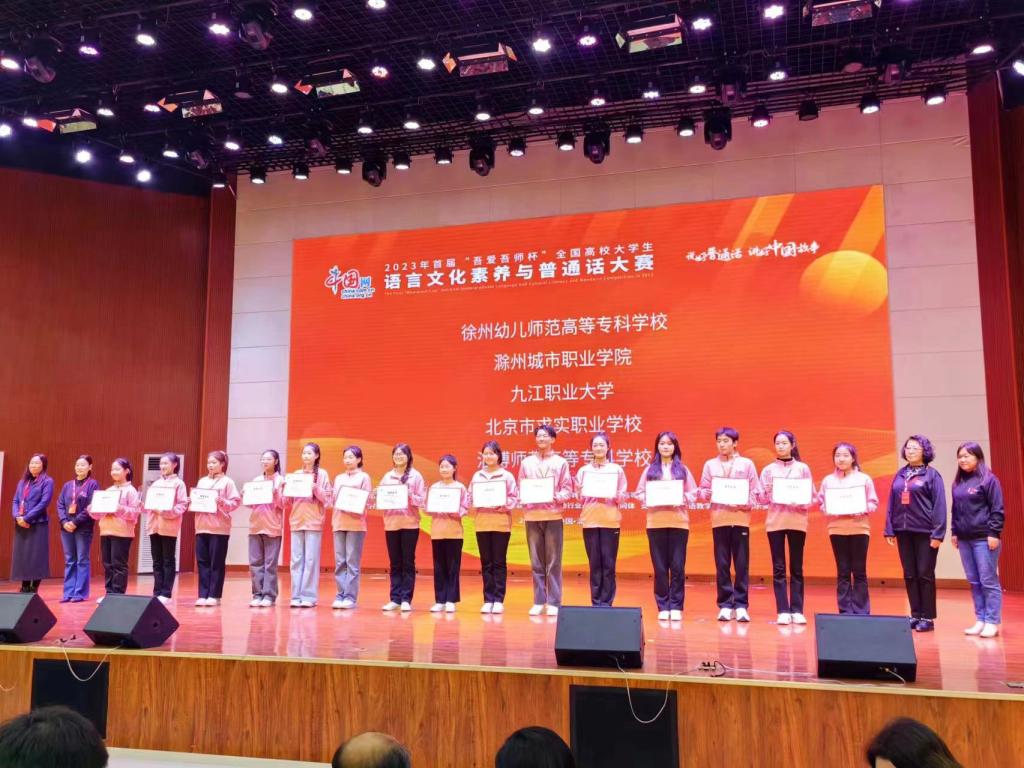 10月16日至10月19日,由山东淄博师范高等专科学校承办的2023年首届“吾爱吾师杯”全国高校大学生语言文化素养与普通话大赛决赛圆满落下帷幕。来自全国各地的49支代表队,经过四天的激烈角逐,我院来自19学前初专6班的肖若彤、21小教初专3班的詹刚、22学前高专5班的魏一凡三位同学获得全国总决赛(高职组)一等奖。(指导老师:汤锦蕾 高梅媛 郎娟娟)