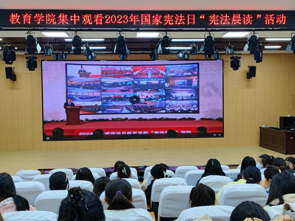 12月4日,教育部组织开展全国教育系统“宪法晨读”活动,我院在报告厅设置集中观看的分会场,全场120余名学生共同参与活动。上午9时30分,我院分会场与全国师生一起举办升旗仪式,进行宪法晨读,合唱宪法主题歌曲《宪法伴我们成长》,观看“学宪法讲宪法”活动优秀学生现场展演等,让青年学生体会宪法温度、感受宪法力量,宪法法治精神得到进一步弘扬。