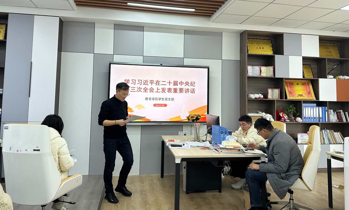 1月9日,教育学院学生党支部在辅导员工作室召开全体党员大会,集中学习习近平总书记在二十届中央纪委三次全会上的重要讲话精神,会议由支部副书记杨维懂主持。