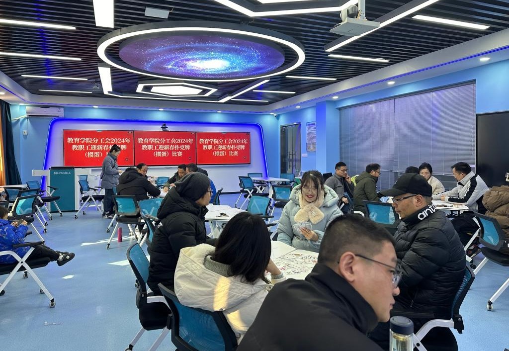 为丰富教职工节日文化活动,促进教职工之间的沟通联谊,1月26日,教育学院分工会举办教职工迎新春扑克牌(掼蛋)比赛,教师们积极参与,踊跃报名。