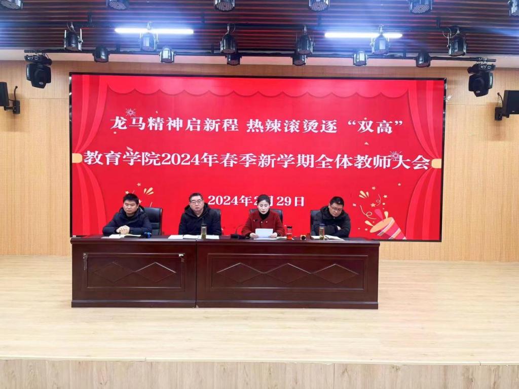 为谋新篇开新局,确保新学期开学各项工作平稳有序进行,2月29日上午,教育学院在C2北1102报告厅召开2024年春季新学期全体教师大会。校党委委员、学院党总支书记高国柱,党总支副书记、院长徐立娟,副院长刘明辉、党总支副书记陈立超及全体教师参加会议,会议由陈立超主持。