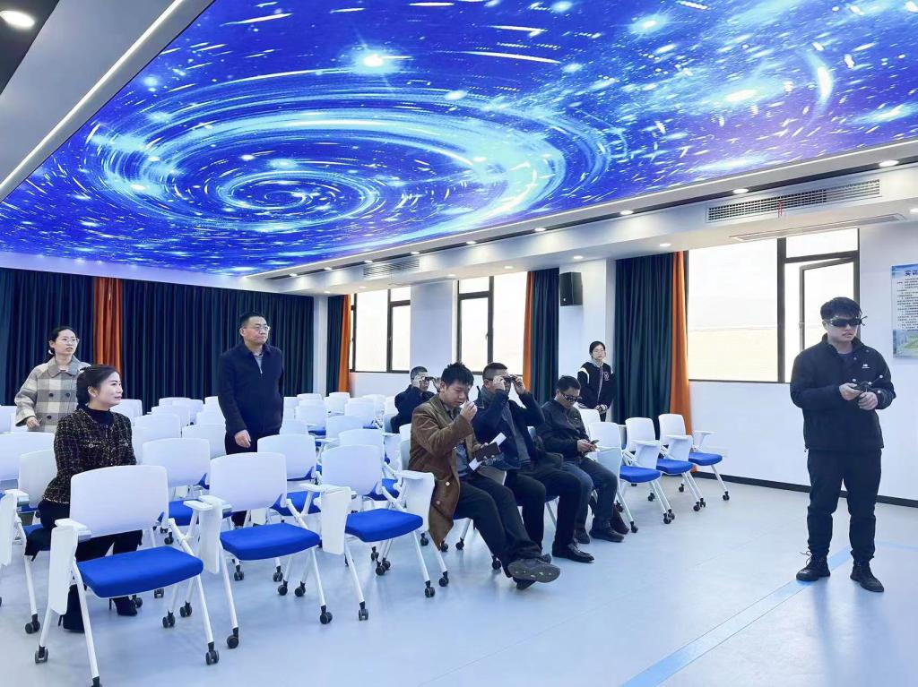 李孔亮一行先后参观了我院学前教育虚拟仿真实训基地的公共虚拟仿真实训中心、桌面式虚拟仿真实验室、沉浸式虚拟仿真实训室、虚实结合(MR)实训室。我院虚拟仿真研创团队负责人张凯针对VR/MR虚拟仿真资源进行了现场演示。