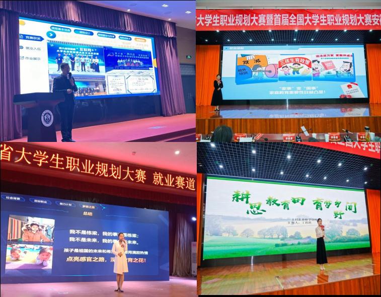 自赛事启动以来,在学校领导的关心指导下,教育学院积极筹备,精心组织,通过宣传动员、院部初赛、校内选拔赛、省级片区赛的层层筛选。经过激烈角逐,教育学院原钥同学(指导教师:张童心、陈立超)获就业赛道二等奖,王米茜(指导教师:魏娟、王静)、丁思琪(指导教师:杨维懂、张晶晶)两位同学获成长赛道二等奖,杨维懂、黄正顺、张晶晶、张童心获教师课程赛道二等奖。