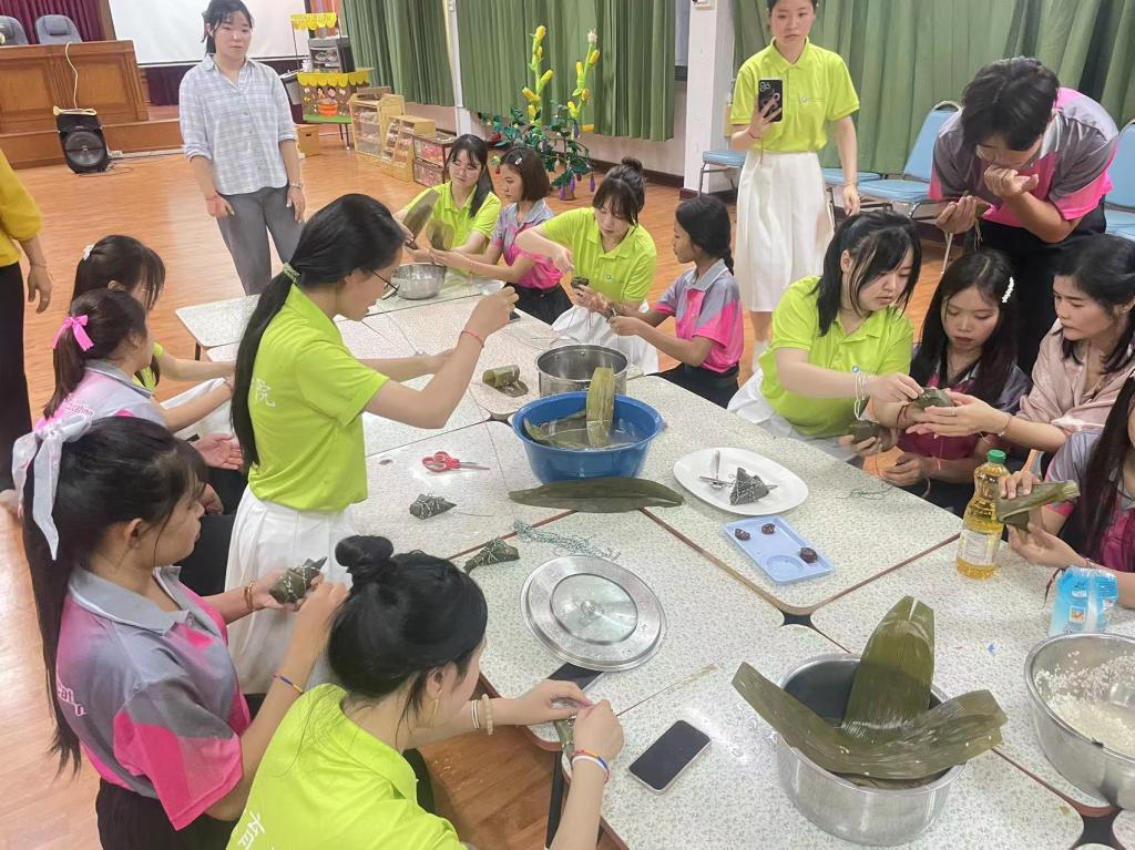 活动伊始,我院学生代表从历史起源、主要习俗、饮食文化、各地特色四个方面为在场的中外同学介绍了端午节的由来与传承。随后,在“中国传统美食制作小课堂”上,我院学生为泰国师、生代表详细介绍了粽子的制作方法,在“小老师”的指导下大家很快掌握了其中技巧,并纷纷尝试实践。泰国教师表示中国的粽子非常好吃,没想到简单的糯米放上蜜枣就会有如此好的口感。大家在包制粽子的过程中感受制作中国传统美食的乐趣,一个个包好的粽子也承载着一份份美好的祝福。