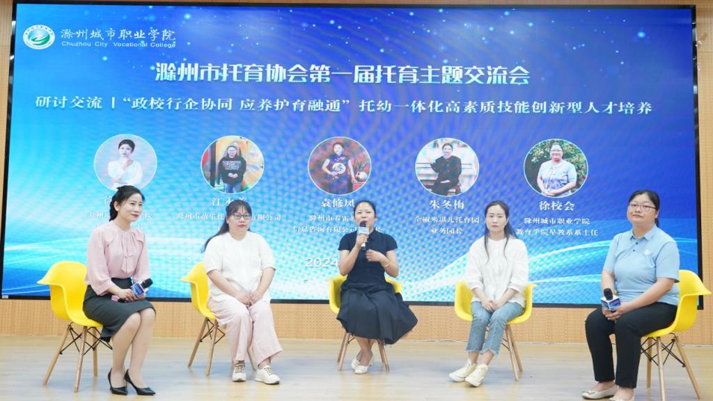 圆桌交流研讨环节围绕“托幼一体化高素质技能创新型人才培养”主题展开。在徐立娟的主持下,整个环节氛围热烈而紧凑。滁州市春雷教育信息咨询有限公司董事长袁修凤、滁州市蓓乐托育服务有限公司总经理江永美、全椒米琪儿托育园业务园长朱冬梅作为企业代表发言,讲述了各自机构的办学初衷、教育理念、教学实践等。发言过程中反复提到的“用爱托举”“家校共育”“医育融合”等观点具有较强的现实指导意义。教育学院早期教育系主任徐校会作为学院代表发言,详细介绍了学院早期教育专业的人才培养模式。